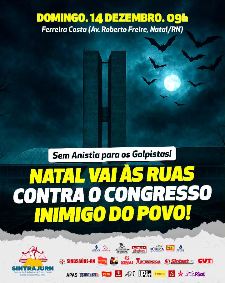 Notícias Natal se mobiliza no domingo contra anistia a golpistas e Congresso inimigo do povo Leia mais