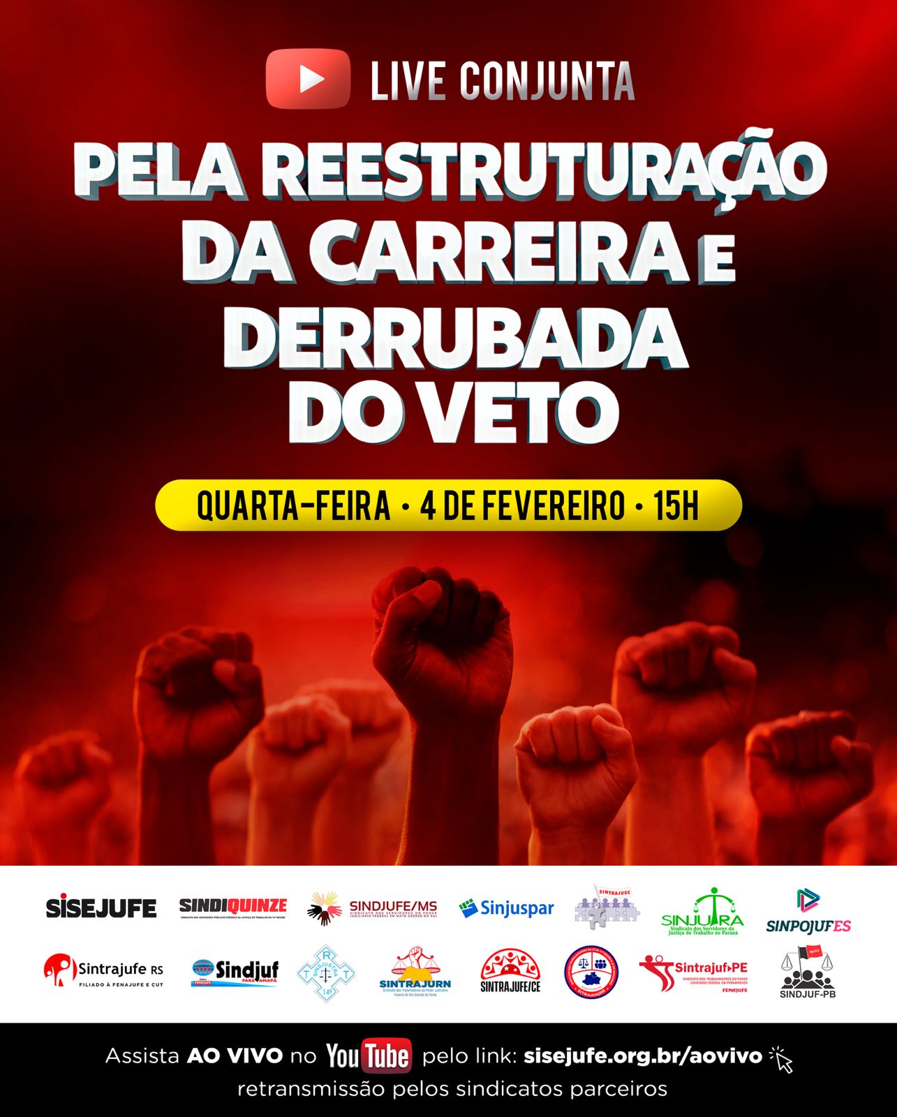 4 de fevereiro - Reestruturação da carreira e a derrubada do veto às parcelas de 2027 e 2028 do PL 4750/25