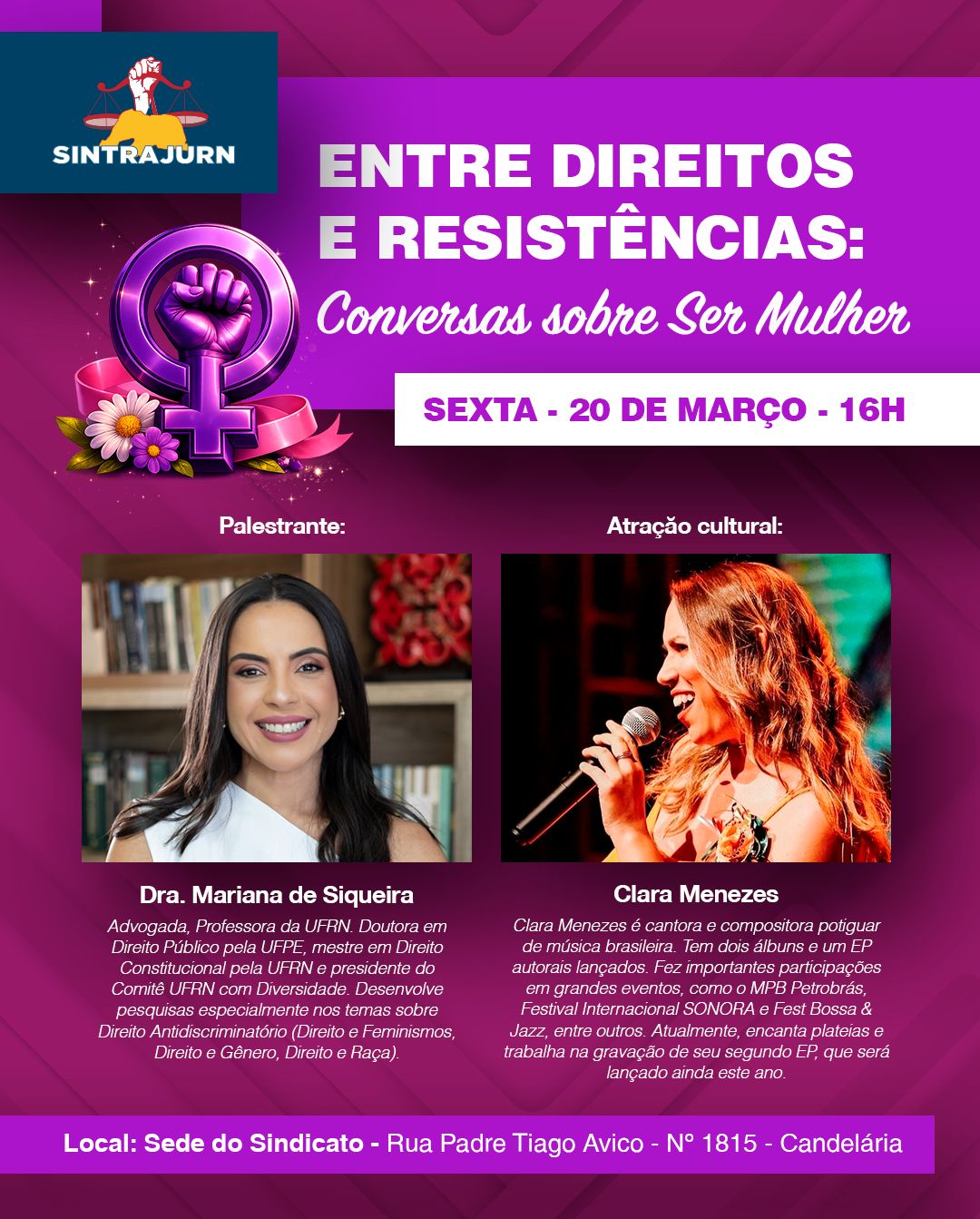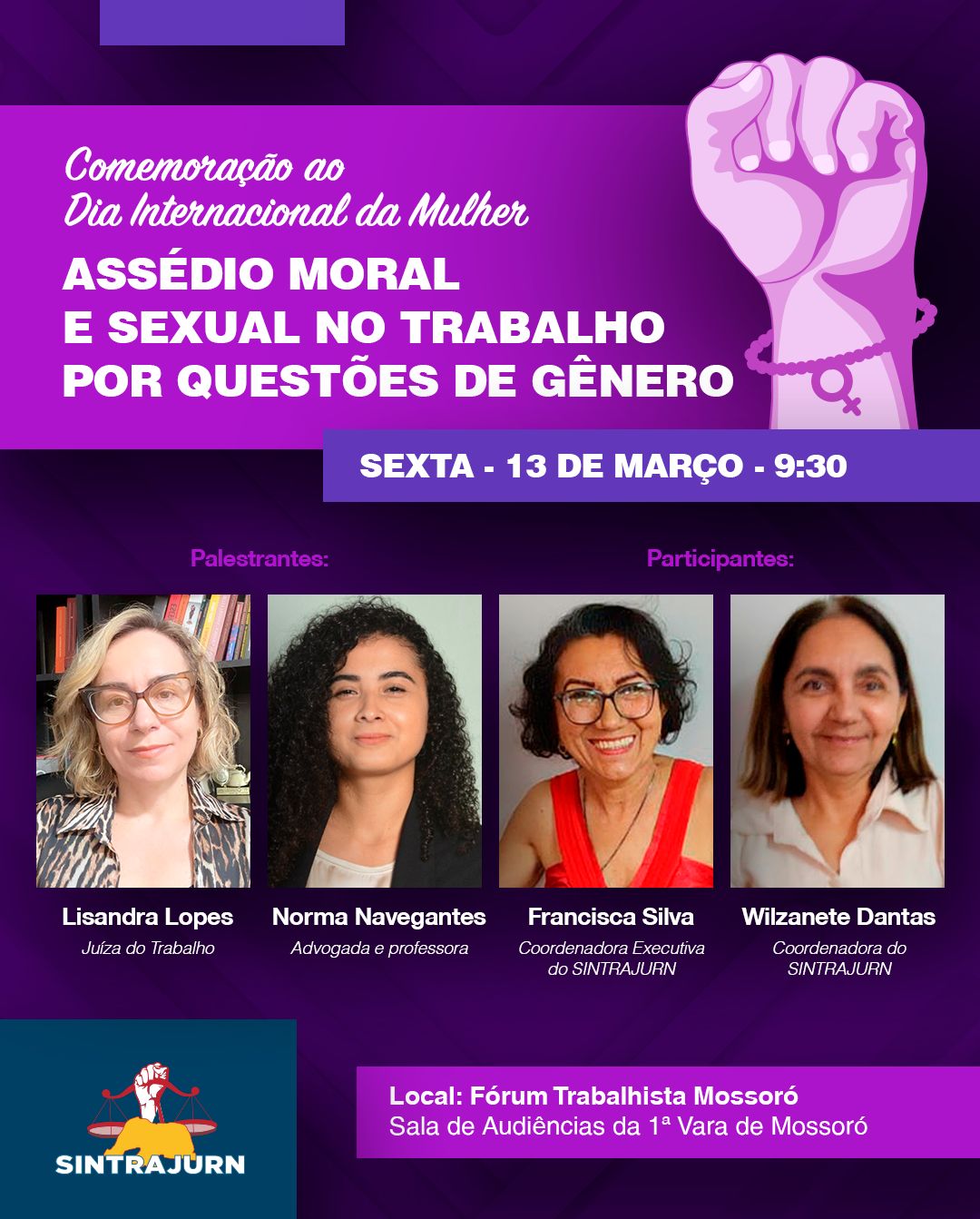 13 de março, às 9h30 no Fórum Trabalhista de Mossoró - Tema: Assédio moral e sexual no trabalho por questões de gênero