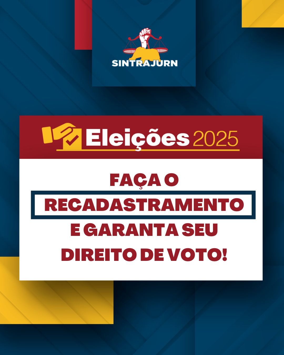 Eleição Diretoria Eleição para a nova diretoria do SINTRAJURN acontece na próxima segunda-feira: faça o recadastramento e garanta seu direito de voto! Leia mais