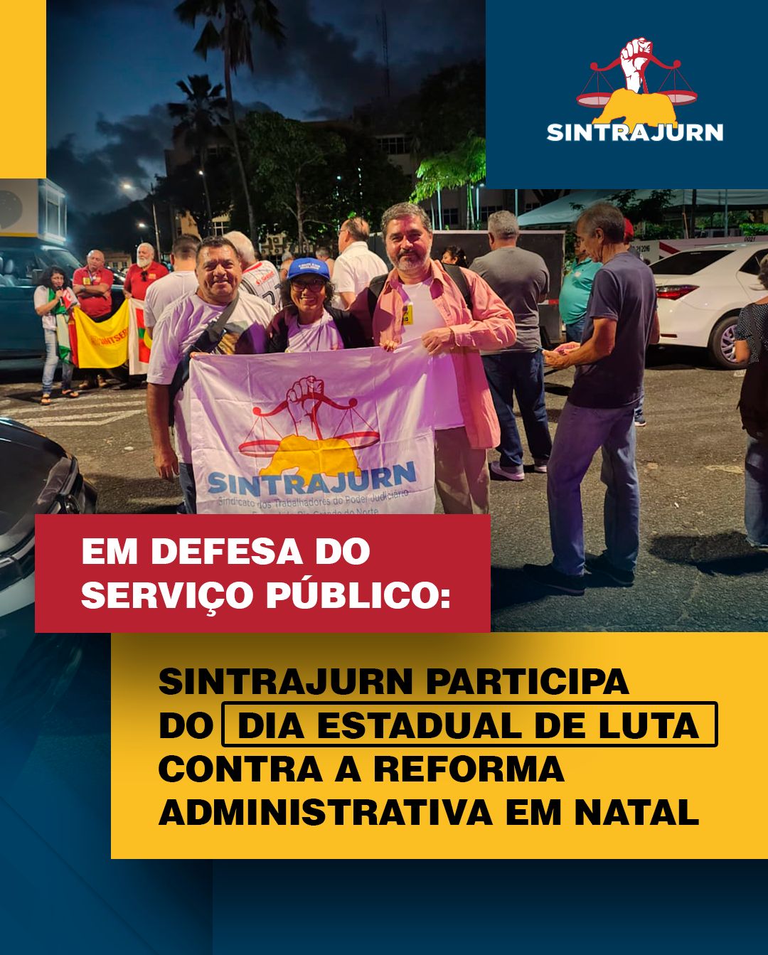 O SINTRAJURN esteve presente, nesta segunda-feira (20), no Dia Estadual de Luta contra a Reforma Administrativa, em Natal, junto com dezenas de entidades representativas do serviço público do Rio Grande do Norte. A mobilização, que reuniu servidores de diferentes esferas, contou também com a presença de deputados estaduais e federais, centrais sindicais e organizações da sociedade civil, em um forte ato em defesa dos direitos do funcionalismo e dos serviços públicos.