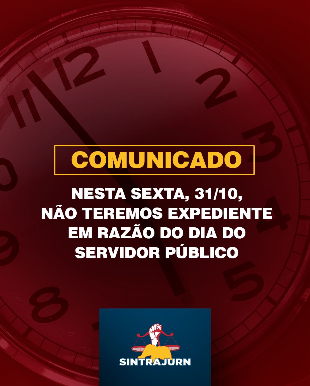 O SINTRAJURN informa que não haverá expediente nesta sexta-feira (31), em virtude da transferência do feriado do Dia do Servidor Público nos tribunais do estado (Justiça Federal, TRT e TRE).