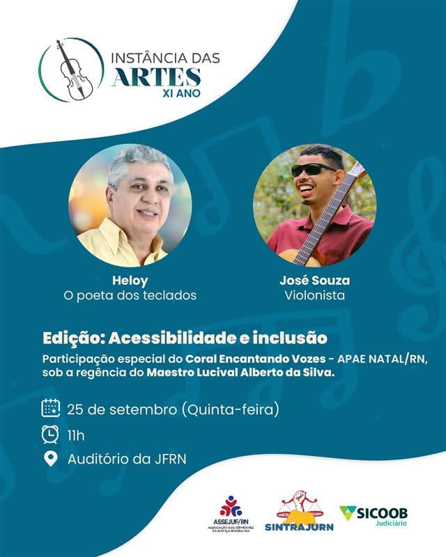 Dentro da programação, o Instância das Artes – projeto cultural da Justiça Federal no Rio Grande do Norte – realizará, em 25 de setembro, às 11h, no auditório da JFRN, a 3ª Edição Especial “Acessibilidade e Inclusão”. A iniciativa busca dar visibilidade ao protagonismo e talento das pessoas com deficiência, celebrando suas potencialidades por meio da arte.