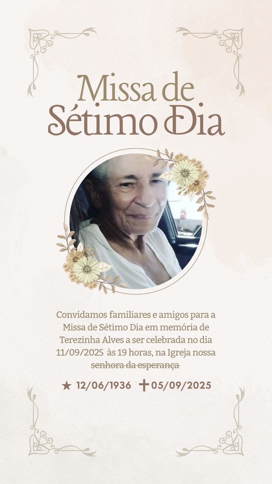 O SINTRAJURN informa que a missa de sétimo dia da senhora Terezinha, mãe do coordenador executivo da entidade e servidor do TRT-21, Edmilson Vitórino, será celebrada nesta quinta-feira (11), às 19h, na Igreja Nossa Senhora da Esperança, localizada na Avenida Pernambuco, 1 – Cidade da Esperança, Natal.