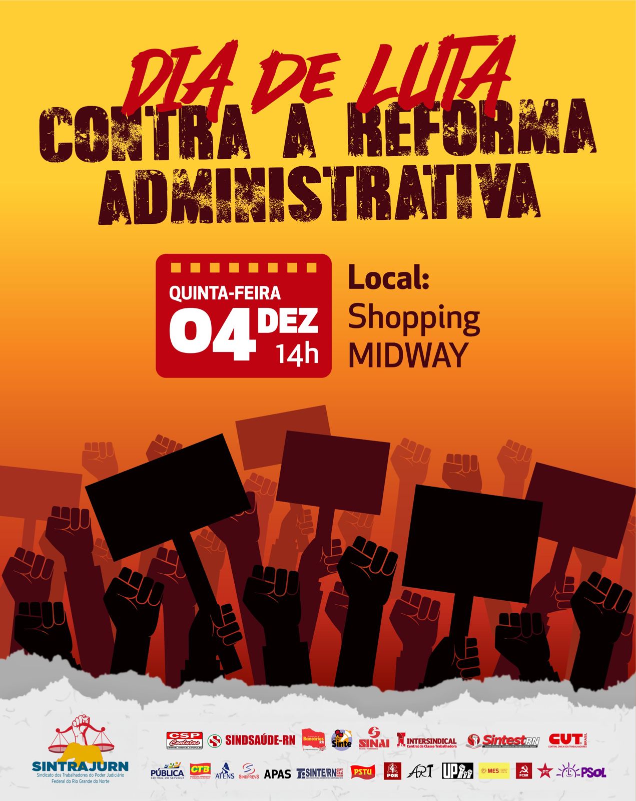 O SINTRAJURN convida todos os servidores públicos do Rio Grande do Norte para participarem do “Dia de Luta contra a Reforma Administrativa”, que acontecerá nesta quinta-feira (04), a partir das 14h, no Shopping Midway, em Natal. A mobilização integra agenda nacional e estadual de resistência à proposta que ameaça a estabilidade e os direitos do funcionalismo público — e representa um ataque direto à qualidade dos serviços prestados à população.